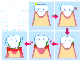 歯の表面に歯垢(プラ―ク)が残ったままにしておくと、歯と歯ぐきの間の歯周ポケットで歯垢中の細菌が繁殖し、歯を支える歯周組織が破壊される病気です。